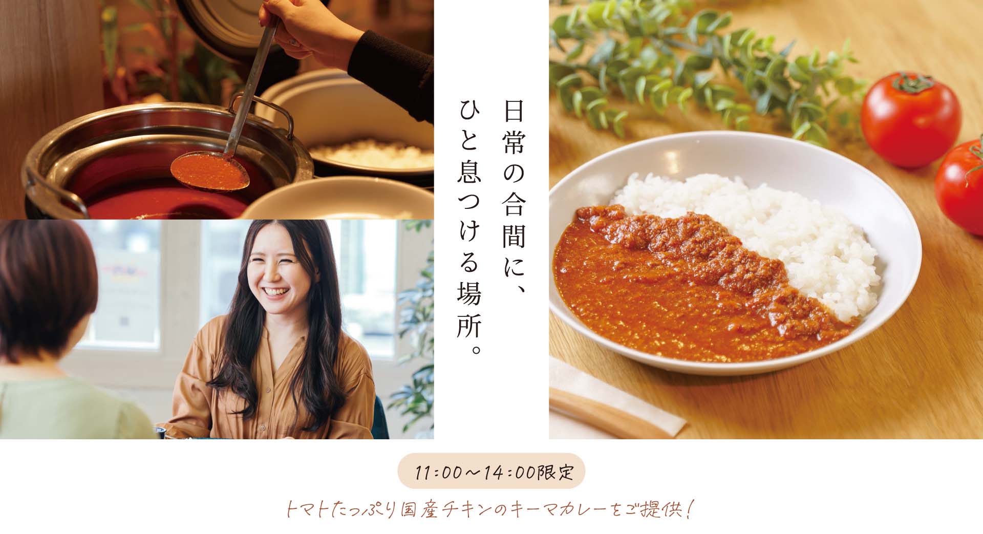 落ち着いた空間で味わう、トマトたっぷり国産チキンのキーマカレー。スープもご用意しており、お湯や電子レンジもご利用いただけます。持ち込みも可能です。