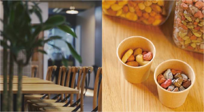 仕事や外出の合間に、小腹を満たせるお菓子や軽食を用意しています。休憩スペースとしても、気軽にご利用ください。